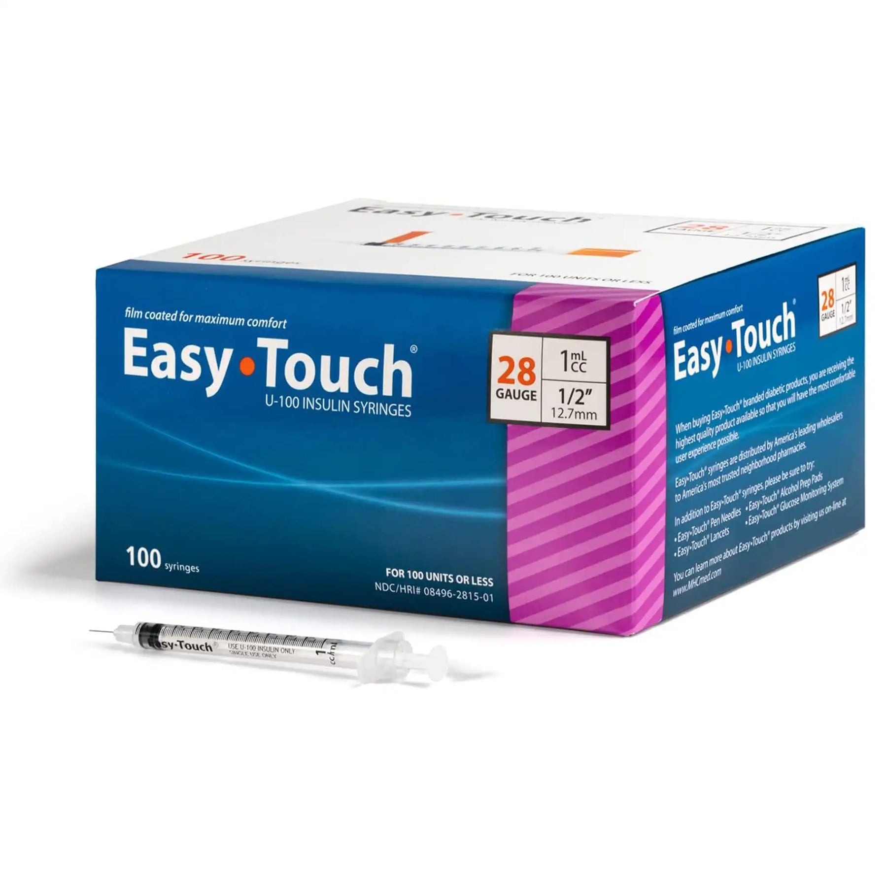 Comfort meets syringes; the EasyTouch 28 gauge 1/2-inch insulin syringes are film coated for maximum comfort and lines up precisely for accurate dosage. They have no "dead space" for accurate dosage and less waste. 100% latex free. EasyTouch insulin syringes provide the best combination of quality, comfort, and value.